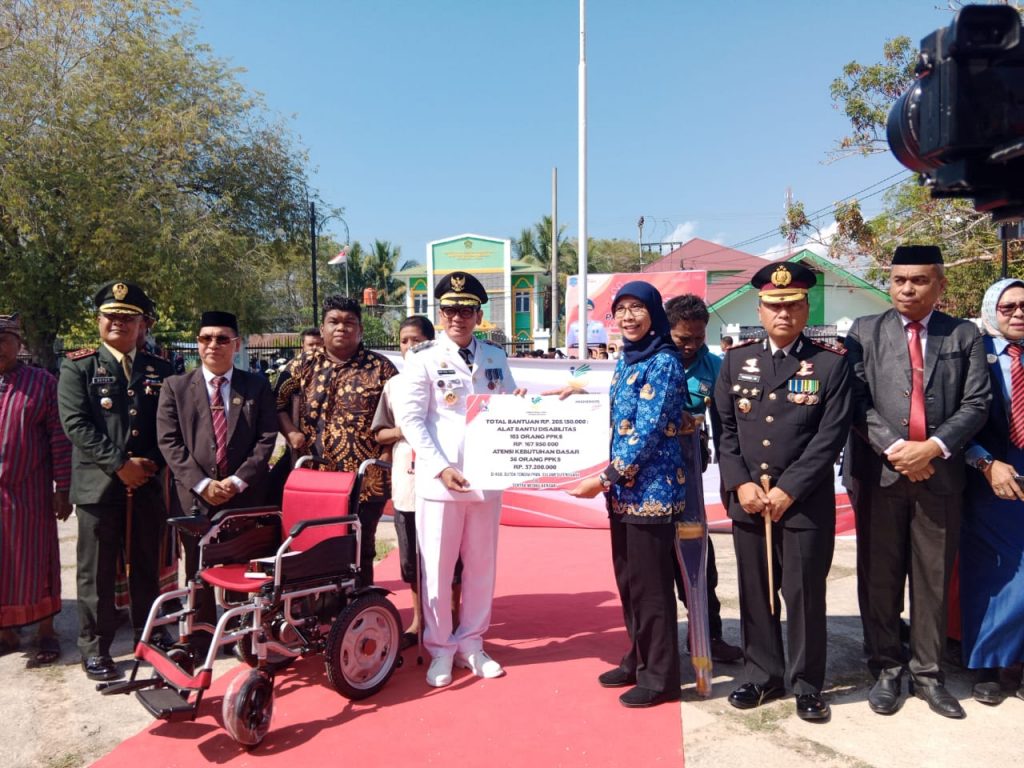 Selanjutnya dirangkaikan penyaluran bantuan Kementerian Sosial RI melalui Direktorat Jenderal Rehabilitasi Sosial Sentra ’MEOHAI Kendari oleh Pj Bupati, bersama Sekda, Kapolres Buteng, Dandim 1413/Buton, dan perwakilan DPRD Buteng, La India, menyerahkan simbolis bantuan terdiri dari satu 1 unit kursi roda, alat bantu bagi penyandang disabilitas dan penyerahan bantuan ATENSI kebutuhan dasar bagi penyandang disablitas. Jumlah keseluruhan bantuan Direktorat Jenderal Rehabilitasi Sosial Sentra ’MEOHAI Kendari sebesar Rp 205.130.000 dengan rincian alat bantu disabilitas 103 orang Rp 167.950.000. Dan ATENSI kebutuhan dasar 36 orang Rp 37.200.000.. *** (ADV)