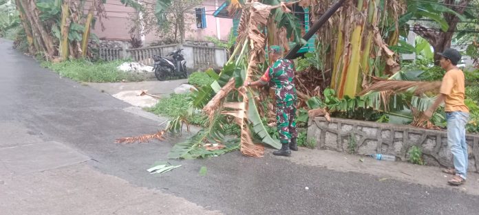 Kopda Pardenade Saputra pun dengan sigap langsung membersihkan lokasi tumbangnya pohon pisang.