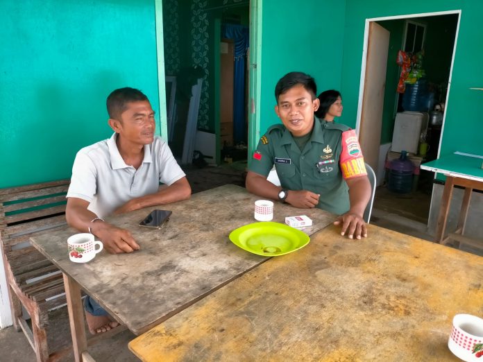 Mandalapos.co.id, Anambas — Anggota Koramil 02 Tarempa, Praka Indra Lesmana, melaksanakan komsos dengan warga bernama Pijan selaku Ketua RW.02 Arung Hijau, Desa Tiangau, Kabupaten Kepulauan Anambas, Selasa (31/10/2023).