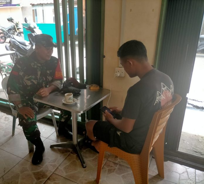 Mandalapos.co.id, Anambas — Anggota Koramil 02 Tarempa, Praka Indra Lesmana, melaksanakan komsos dengan seorang warga di salah satu kedai kopi di Tarempa, Kabupaten Kepulauan Anambas, Kamis (21/12/2023).