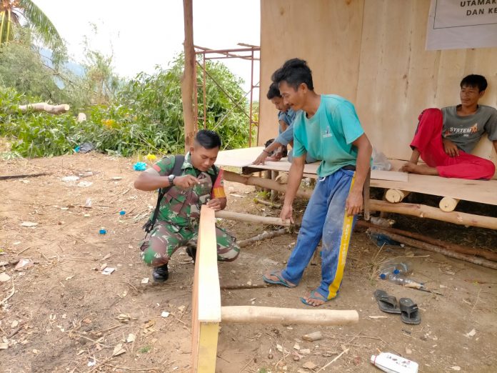 Mandalapos.co.id, Anambas — Anggota Koramil 02 Tarempa, Praka Indra Lesmana, melakukan komsos dengan seorang warga Desa Tarempa Timur bernama Wahab, yang sedang memperbaiki rumahnya, Sabtu (23/9).