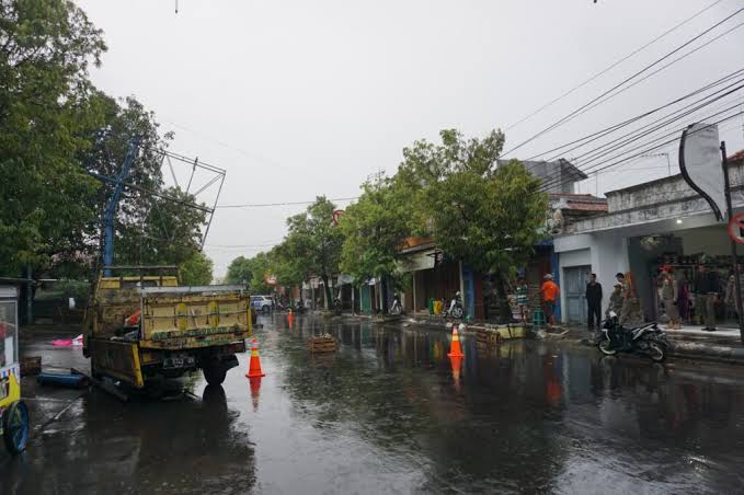 Mandalapos.co.id, Indramayu — Tingginya Intensitas hujan disertai angin kencang pada Selasa (28/2/2023) sore, mengakibatkan reklame di Jalan Ahmad Yani atau tepatnya di depan Pasar Mambo Kabupaten Indramayu, tampak miring dan hampir roboh.