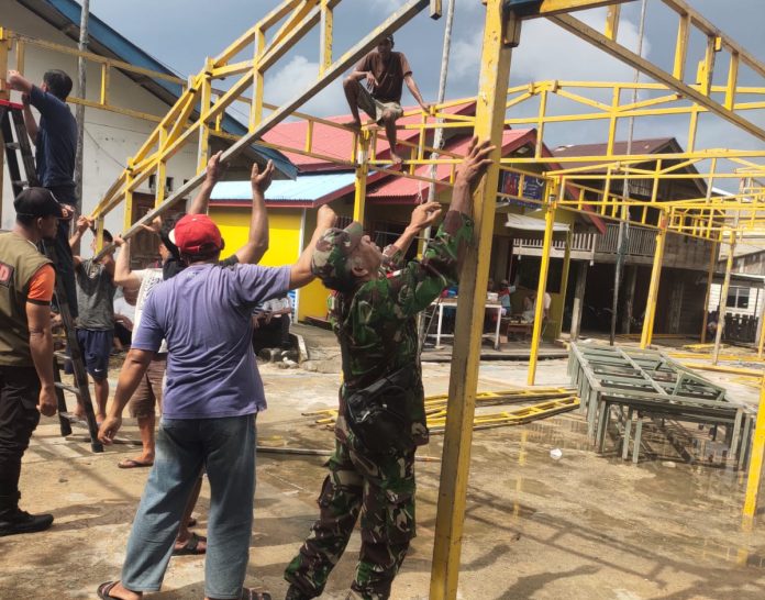 Sambil Komsos Serda Binran Bantu Warga Letung Persiapkan Resepsi Pernikahan