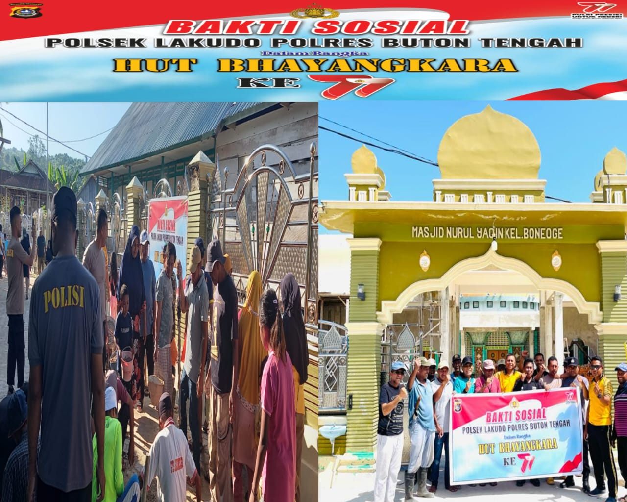 Mandalapos.co.id, Buton Tengah – Dalam rangka menyambut Hari Ulang Tahun (HUT) Bhayangkara ke-77 tahun 2023, Personil Polsek Lakudo Polres Buton Tengah melaksanakan kegiatan kerja bakti sosial (Baksos) di Mesjid Nurul Yaqin Kelurahan Boneoge, Kecamatan Lakudo, Kabupaten Buton Tengah, Jum’at (16/6/2023).