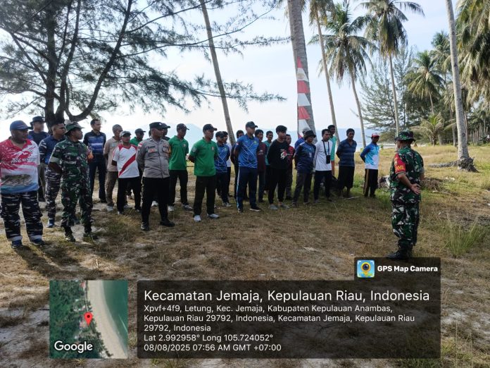 Anambas, Mandalapos.co.id – Dalam rangka memperingati HUT RI ke-80, Danramil 04/Letung Letda Inf H. Simbolon bersama personel Koramil 04/Letung menggelar kegiatan gotong royong pembersihan Pantai Padang Melang, Jumat (8/8/2025) pagi. Kegiatan yang dimulai pukul 07.00 WIB ini berlangsung di RT 001/RW 001 Desa Batu Berapit, Kelurahan Letung, Kecamatan Jemaja, Kabupaten Kepulauan Anambas.