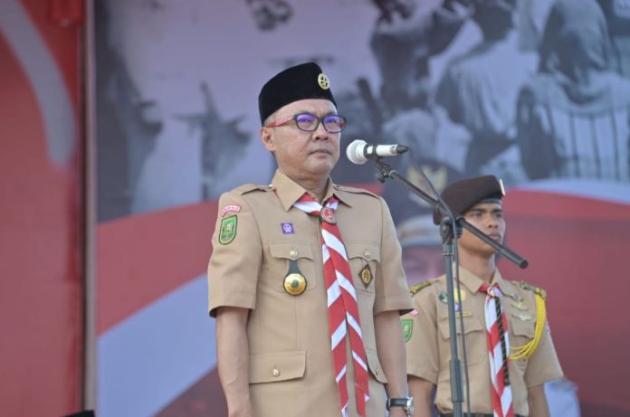 Sekretaris Daerah dr. Ersan Saputra TH menjadi Pembina Upacara Pelaksanaan Apel Besar Peringatan Hari Pramuka ke-63, di Lapangan Tugu Bengkalis, Minggu (18/8/2024). (Foto: dok. Diskominfo Bengkalis)