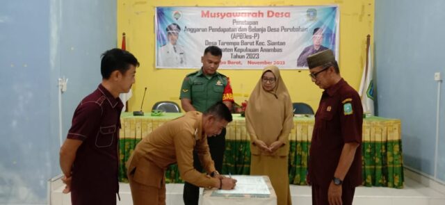 Mandalapos.co.id, Anambas — Babinsa Koramil 02 Tarempa, Serda Alex ps menghadiri undangan kegiatan musyawarah desa (musdes) Penetapan Anggaran Pendapatan dan Belanja Desa Perubahan (APBDes-P) Tahun 2023 Desa Tarempa Barat, Kabupaten Kepulauan Anambas, Selasa (21/11).