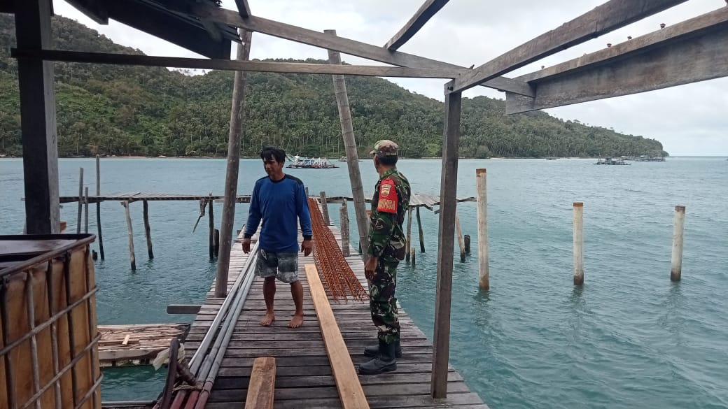 Mandalapos.co.id, Anambas — Babinsa Koramil 04/Letung, Serda R.A.Binran Bol Hutabarat, melaksanakan komsos dengan pekerja bangunan yang sedang melaksanakan kegiatan rehab tambatan kapal atau pelantar kayu tempat bersadarnya kapal minyak Km.Putri Ayu Gt.171 di Desa Landak, Kabupaten Kepulauan Anambas, Kamis (16/1/2024).