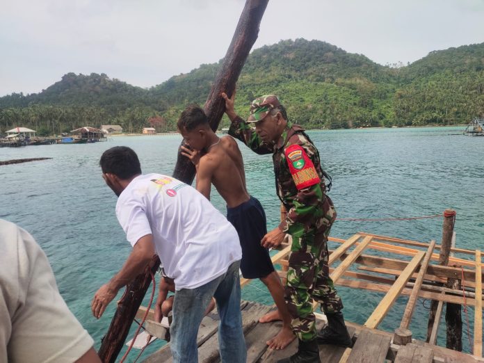 Dalam kegiatan tersebut, Babinsa turut membantu Fahmi, seorang tukang yang sedang mengerjakan pemasangan tiang pelantar yang akan digunakan sebagai tempat bersandar pompong atau perahu warga.