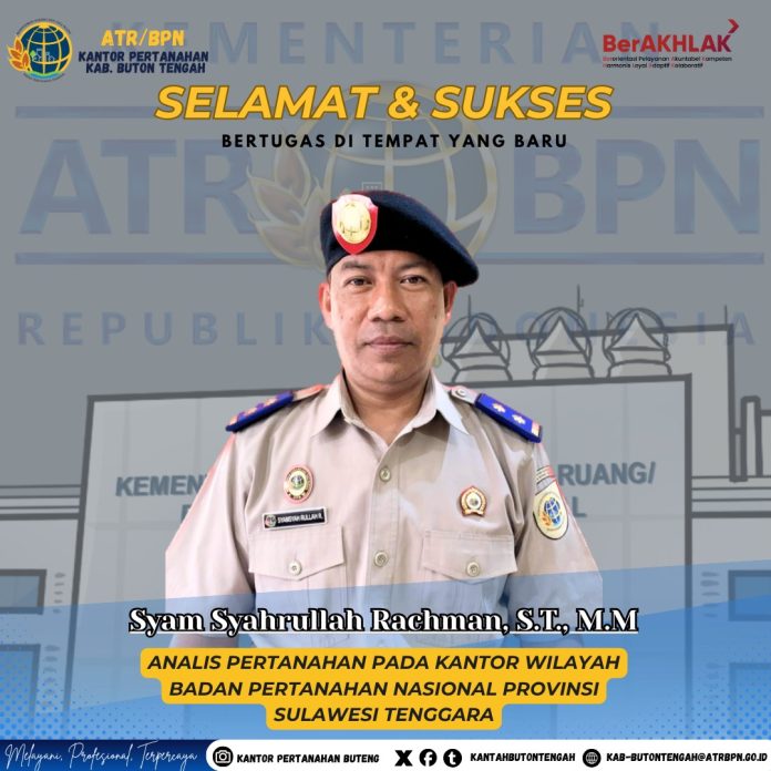 Buton Tengah, Mandalapos.co.id – Keluarga besar Kantor Pertanahan Kabupaten Buton Tengah menyampaikan ucapan terima kasih dan apresiasi yang tinggi kepada Syam Syahrullah Rachman, S.T., M.M. atas dedikasi dan pengabdian yang telah diberikan selama bertugas di Buton Tengah.