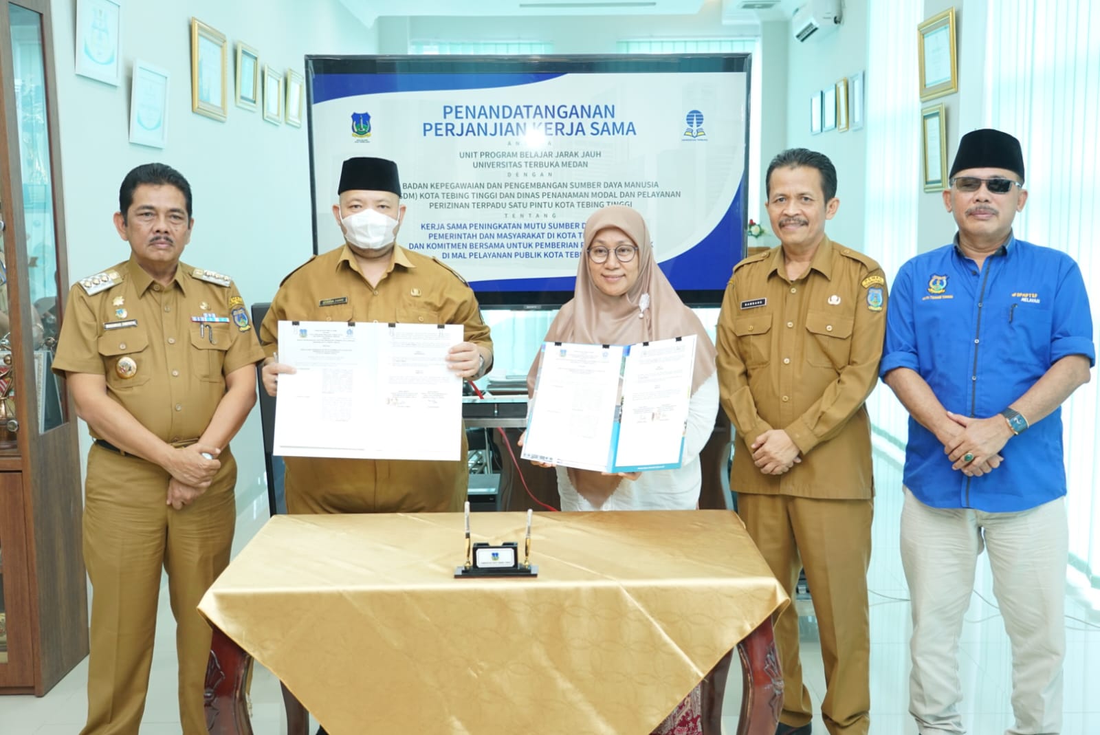 Mandalapos.co.id, Tebing Tinggi — Menindaklanjuti Mou yang telah dilakukan sebelumnya, Pemerintah Kota Tebing Tinggi melalui Badan Kepegawaian dan Pengembangan Sumberdaya Manusia (BKPSDM) dan Dinas Penanaman Modal dan Pelayanan Perizinan Terpadu Satu Pintu (DPMPTSP) Kota Tebing Tinggi, melakukan penandatanganan kerjasama dengan Universitas Terbuka (UT) Medan, Senin (10/10/2022) di Ruang Kerja Wali Kota Lantai 4 Balai Kota, Jalan Sutomo.