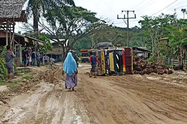 Mandalapos.co.id, ACEH TIMUR – Satu unit truk pengangkut kelapa sawit terguling di ruas jalan lintas antara Kabupaten Aceh Timur dengan Gayo Lues, tepatnya di Desa Teumpeun, Pureulak Barat, Kamis (10/3). Sementara satu unit truk lainnya juga terjebak dalam kubangan lumpur di depan SMA 1 Ranto Peureulak.