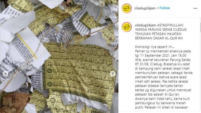 “Biasanya adat di kampung kami, selesai akad nikah membunyikan petasan, sebagai tanda pemberitahuan acara akad nikah sudah selesai. Pas ketika selesai petasan dibakar ternyata bahan kertas yang digunakan untuk membuat petasan tersebut adalah Alquran. Awalnya kami tidak tahu, karena kulit pembungkus itu berwarna merah putih. Petasan ini dibeli di kawasan Kebon Manggis Pondok Kacang Timur, Pondok Aren Tangsel,” tulis pengunggah.