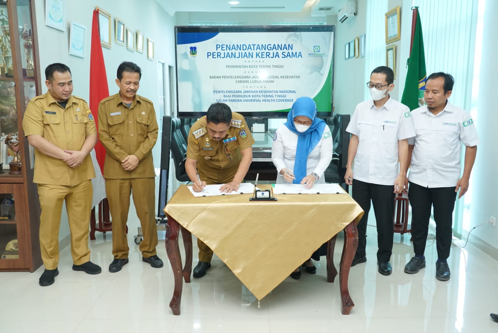 Mandalapos.co.id, Tebing Tinggi — Pemerintah Kota Tebing Tinggi dan BPJS Kesehatan Cabang Lubuk Pakam melakukan penandatanganan Memorandum of Understanding (MoU) terkait Universal Health Coverage (UHC) atau Sistem Penjamin Kesehatan, Senin (24/10/2022) di Balai Kota, Jalan Sutomo.